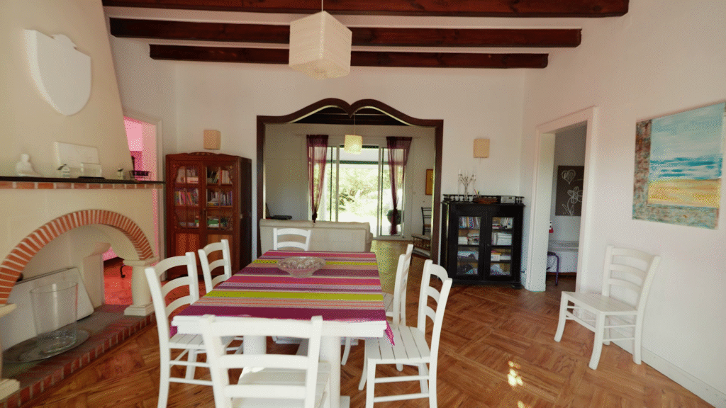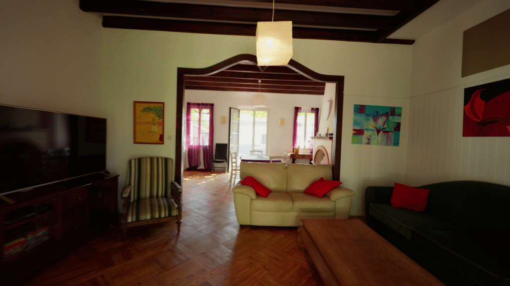 Les nombreuses ouvertures, les volumes traversants, les parquets de bois massifs et les poutres apparentes créent une atmosphère authentique et conviviale.