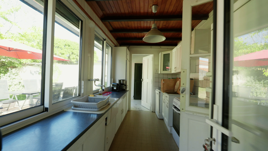 Grande baie vitrée donnant sur la terrasse, plan de travail long, nombreux rangements — un espace idéal pour des séjours familiaux et des locations saisonnières.
