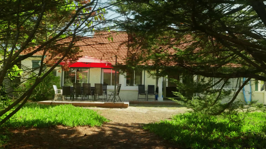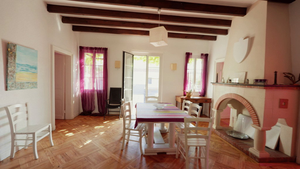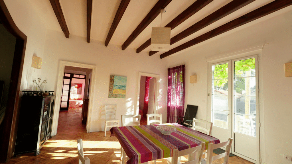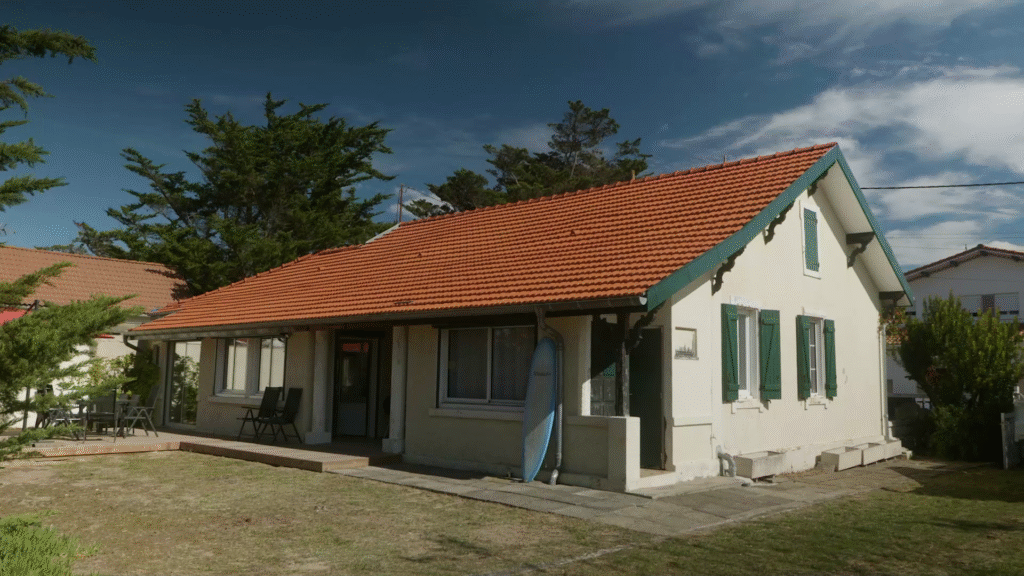 À seulement 4 minutes à pied de l’océan, la villa La Brise est une maison emblématique de Mimizan Plage. Construite en 1924, elle fait partie de ces propriétés qui capturent immédiatement le charme de la Côte d’Argent : façades claires, volets verts, lumière omniprésente, parquet ancien en chevrons, grande hauteur sous plafond et atmosphère de vacances toute l’année.